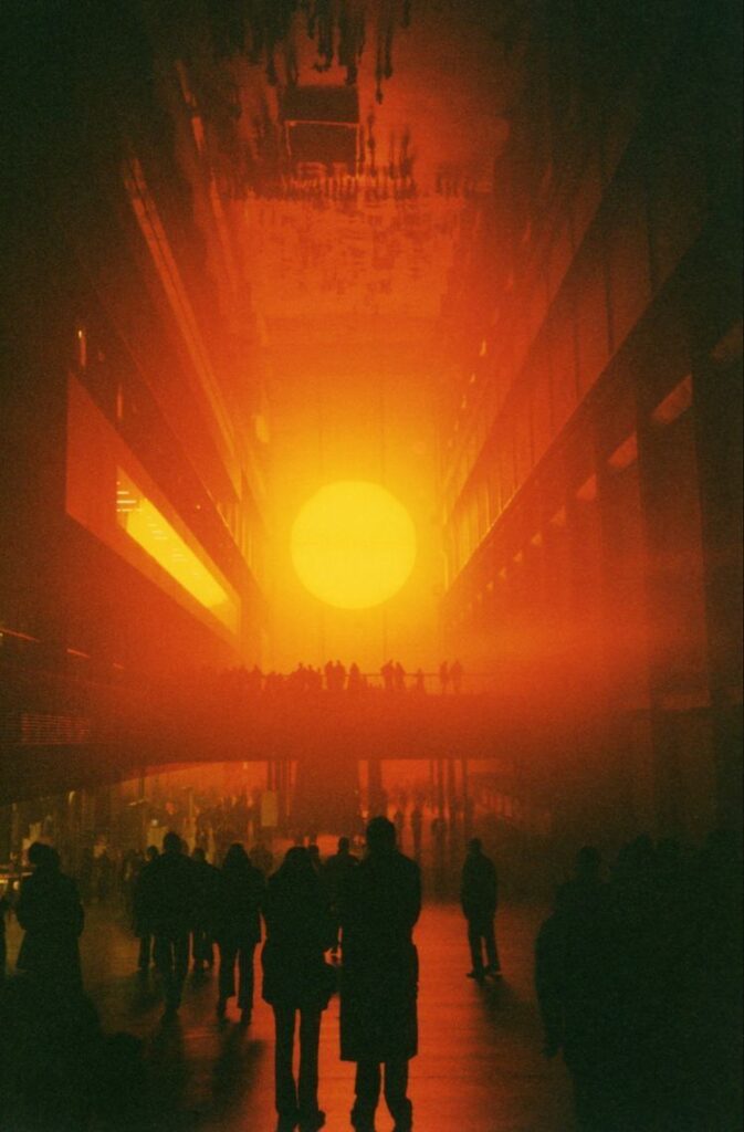 En 2003, le Tate Modern a accueilli l’une de ses expositions les plus mythiques : The Weather Project d’Olafur Eliasson. En entrant dans la Turbine Hall, les visiteurs découvraient un soleil géant suspendu au plafond, baignant l’espace d’une lumière dorée et brumeuse. Le tout était créé à partir de simples lampes monofréquences et de miroirs. Les gens s’allongeaient au sol, contemplaient leur reflet infini et prenaient le temps — littéralement — de se perdre dans cette illusion lumineuse. Une œuvre immersive, presque spirituelle, qui faisait réfléchir sur notre lien avec la nature et la perception du temps.